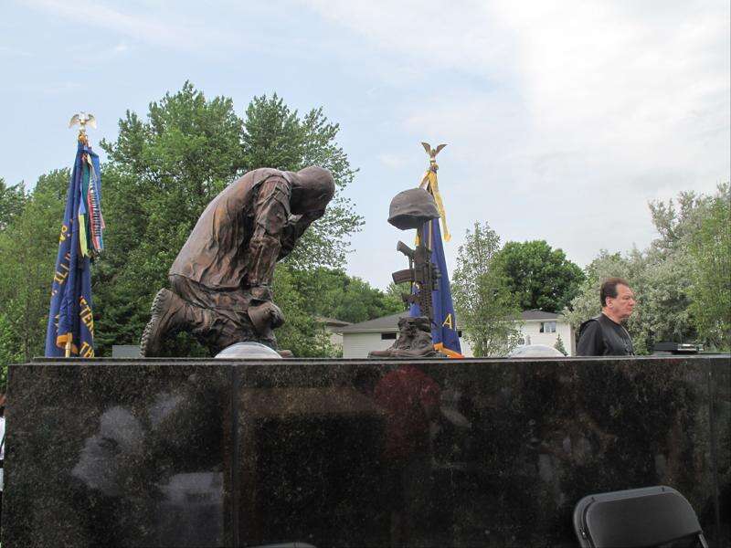 The $180,000 first phase of the memorial includes a sculpture of a soldier mourning a fallen comrade, four memorial benches, a walkway with bricks engraved for donors, an American flag and one flag for each branch of the military.