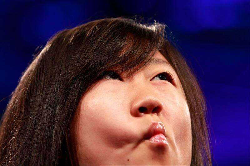 Naomi Li, 14, of Center Valley, Pa. thinks hard about how to spell her word during the National Spelling Bee, Wednesday in Oxon Hill, Md. Associated Press