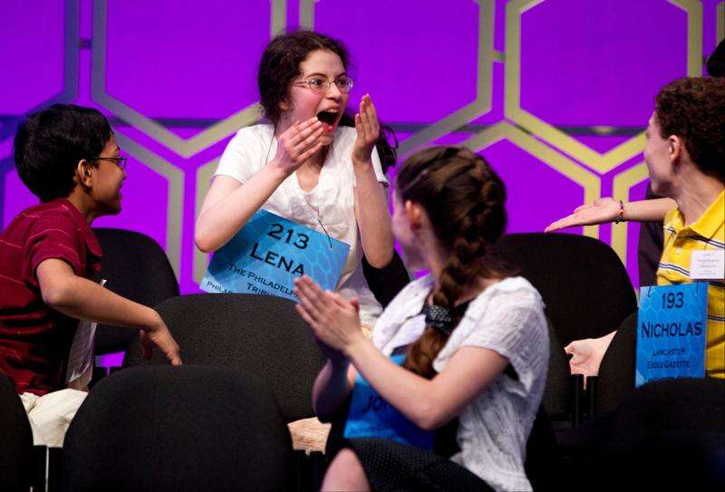 Lena Greenberg, 14, of Philadelphia, celebrates with other contestants after spelling the word “cholecystitis” correctly during the semifinal round of the National Spelling Bee, Thursday, May 31, 2012, in Oxon Hill, Md. Associated Press