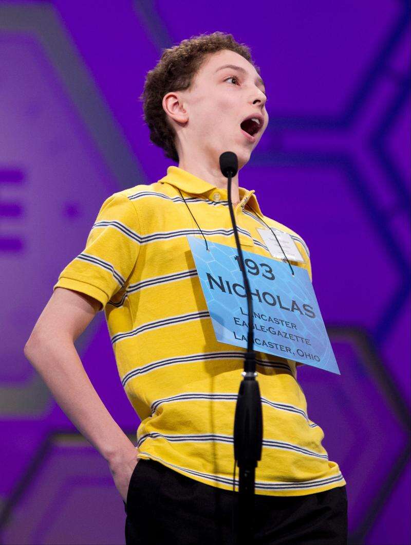 Nicholas Rushlow, 14, of Pickerington, Ohio, reacts to spelling the word “kanaima” correctly during the semifinal round of the National Spelling Bee, Thursday, May 31, 2012, in Oxon Hill, Md. Associated Press