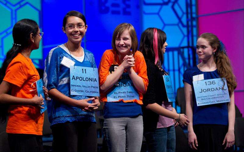 Contestants, from left, Kavyapranati Pratapa of Ypsilanti, Mich., Apolonia Gardner of Imperial, Calif., Abigal Violet Spitzer of El Paso, Texas, Vismaya Jui Kharkar of Bountiful, Utah, and Jordan Gabriella Hoffman of Lee’s Summit, Mo., celebrate after learning they qualified for the semifinal round of the National Spelling Bee on Wednesday, May 30, 2012 in Oxon Hill, Md. Associated Press