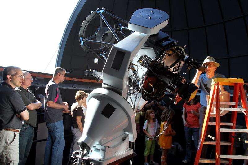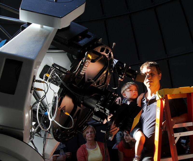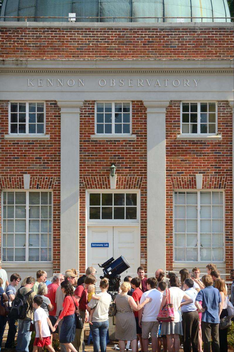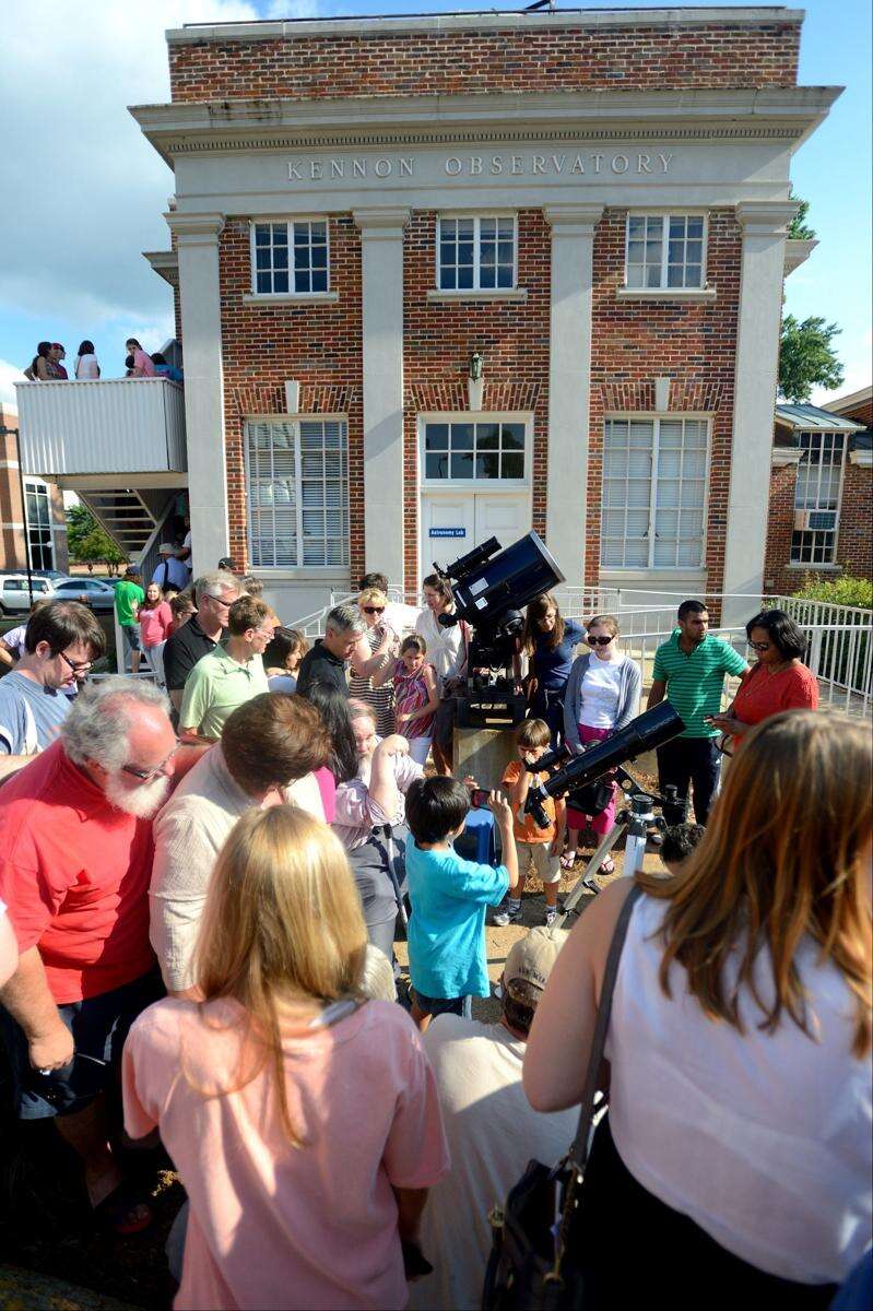 The photo provided by Ole Miss Communications shows astronomy enthusiasts gather to view the transit of Venus in front of the sun at the Kennon Observatory at The University of Mississippi in Oxford, Miss., Tuesday, June 5, 2012.