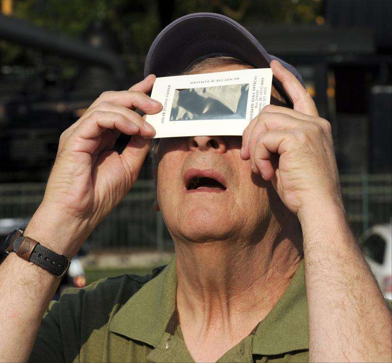 Joseph R. Caruso, of Newburgh, Ind. uses a viewing device made to safely look at solar eclipses as he tries to see the transit of Venus on Tuesday, June 5, 2012. Caruso was one of the people who set up their telescopes along the Ohio River behind the Evansville Museum of Arts, History & Science in Evansville, Ind. to watch as the planet moves in front of the sun. Although some people said they could see the small dot of Venus using this viewer, Caruso was not having any luck.