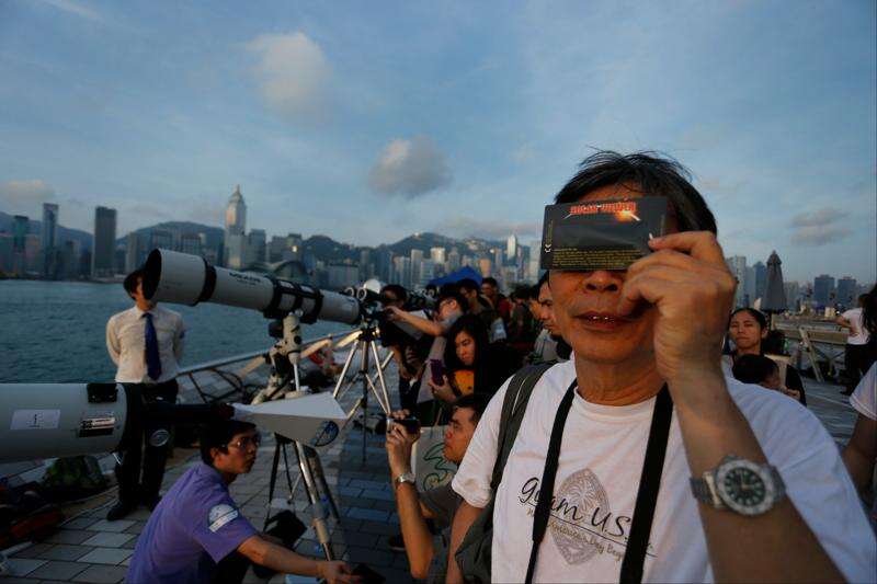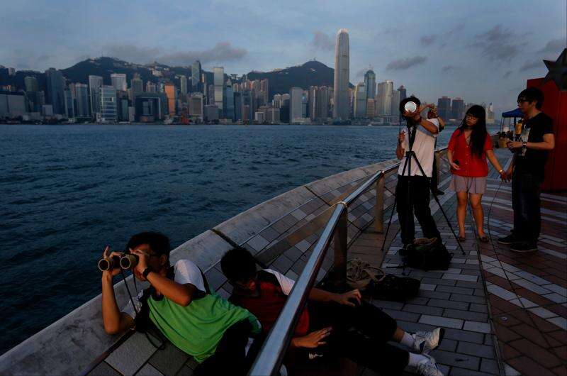 Hong Kong stargazers use telescopes and special sunglasses to observe the transit of Venus along the Victoria Habour in Hong Kong Wednesday, June 6, 2012. Stargazers around the world are setting up special telescopes and passing out cardboard eclipse glasses to view the once-in-a-lifetime celestial cameo of Venus passing in front of the sun.