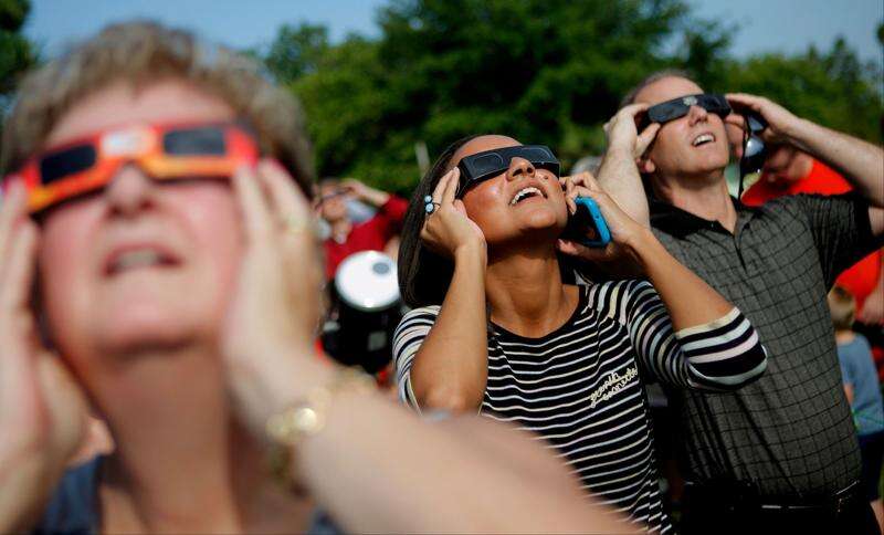 Erin Kozakiewicz, center, and Steve Whelchel, right, use glasses while viewing the transit of Venus in front of the sun with the Oklahoma Astronomy Clubs viewing at the Science Museum of Oklahoma on Tuesday, June, 5, 2012.