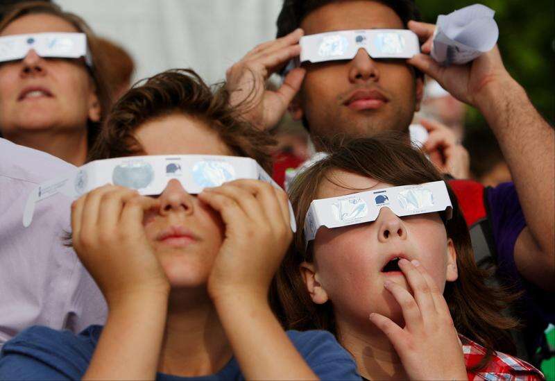 Indian children use cardboard eclipse glasses as they prepare to watch the transit of Venus in Allahabad, India, Tuesday, June 5, 2012. Stargazers around the world are setting up special telescopes and passing out cardboard eclipse glasses to view the once-in-a-lifetime celestial cameo of Venus passing in front of the sun. Venus is Earths second-closest neighboring planet.