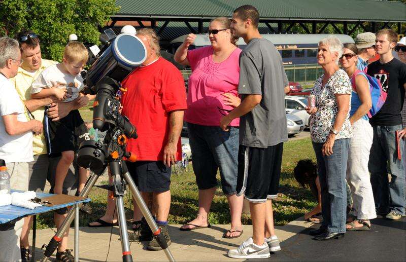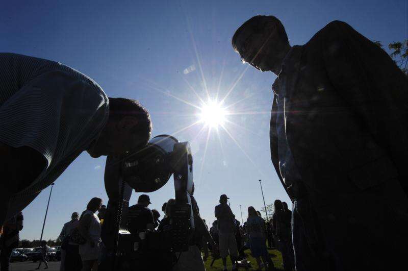 Alexandria Kapko, 12, of Palatine observes Venus crossing the face of the sun Tuesday evening. Palatine attorney James Wotal was there to help people lined up at the telescope find the planet during viewing of the event at Harper College.