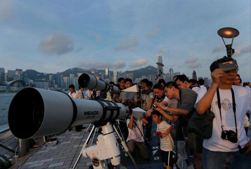 Hong Kong stargazers use telescopes to observe the transit of Venus along the Victoria Habour in Hong Kong Wednesday, June 6, 2012. Stargazers around the world are setting up special telescopes and passing out cardboard eclipse glasses to view the once-in-a-lifetime celestial cameo of Venus passing in front of the sun.