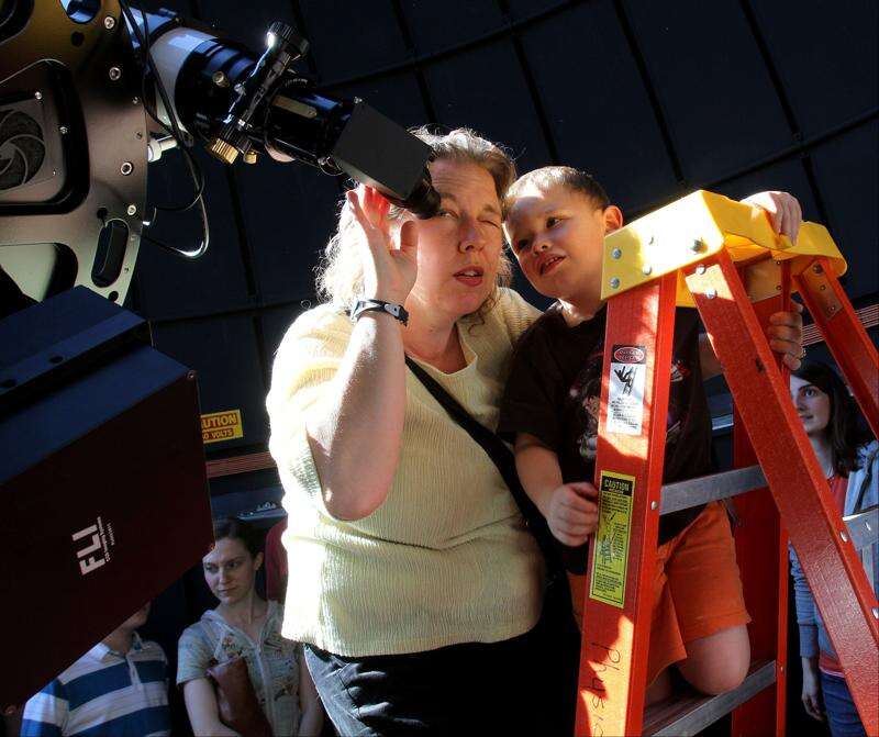 Alta Johnson of Wheaton takes a look through the main telescope with her son Ethan, 4, at the Wheaton College Astronomical Observatory, which opened Tuesday evening for free viewings of the Transit of Venus.