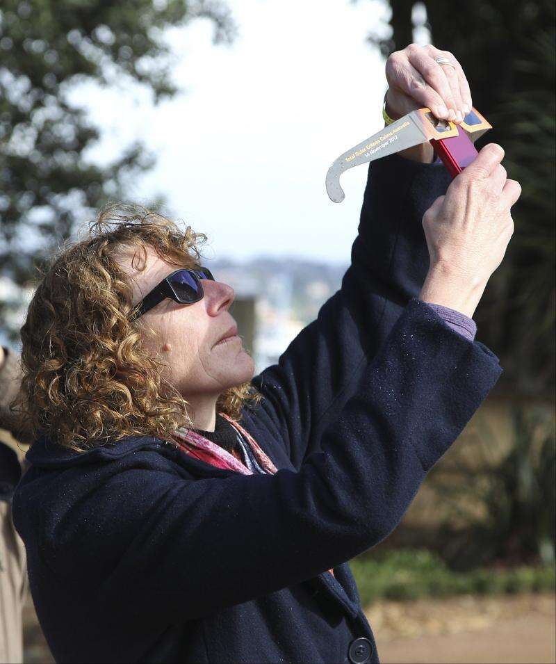 A woman holds a pair of solar viewing glasses to her mobile phone to photograph Venus passing the sun at the Sydney Observatory in Sydney, Australia, Wednesday, June 6, 2012.