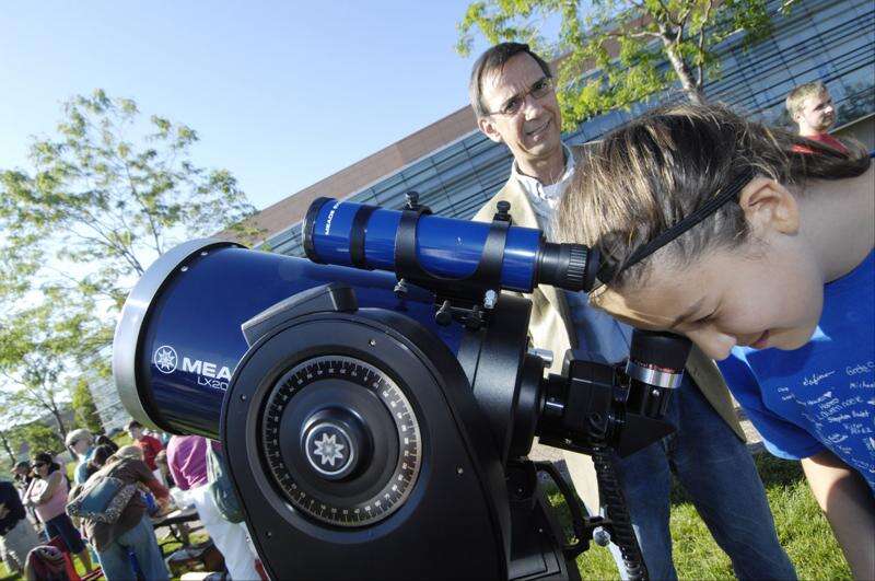 Sam Gibbons, 8, of Lombard, takes a look through a smaller telescope on the roof of the Wheaton College Astronomical Observatory, which opened Tuesday evening for free viewings of the Transit of Venus. On the right is Sams sister Gracie, 10 and on the left is student Daniel Flavin, helping out with the event. Hundreds of people lined up to look through several different telescopes.