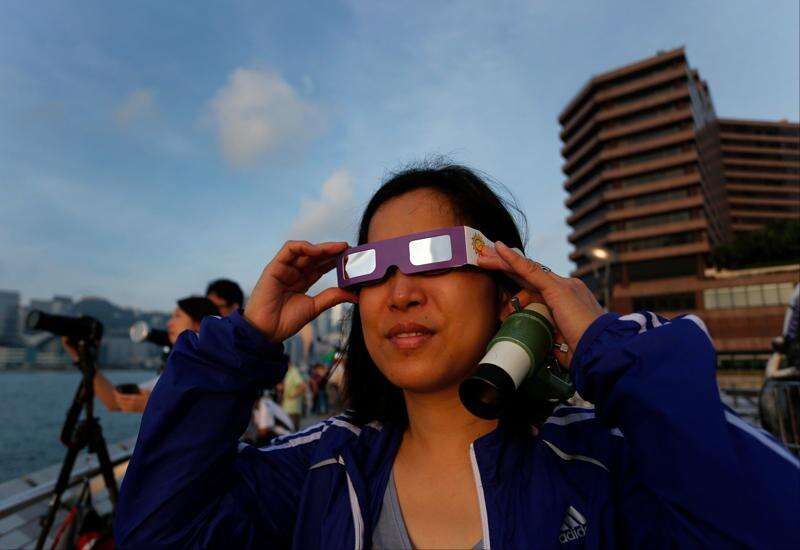 A Hong Kong stargazer uses a special sunglasses to observe the transit of Venus along the Victoria Habour in Hong Kong Wednesday, June 6, 2012. Stargazers around the world are setting up special telescopes and passing out cardboard eclipse glasses to view the once-in-a-lifetime celestial cameo of Venus passing in front of the sun.
