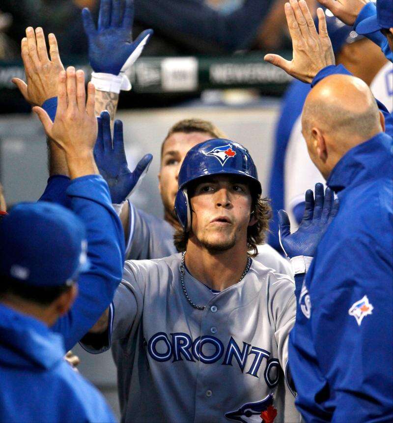 The Blue JaysÂ’ Colby Rasmus is greeted in the dugout after hitting the first of a pair of 2-run homers off White Sox starting pitcher Philip Humber in the fifth inning Tuesday night. Associated Press