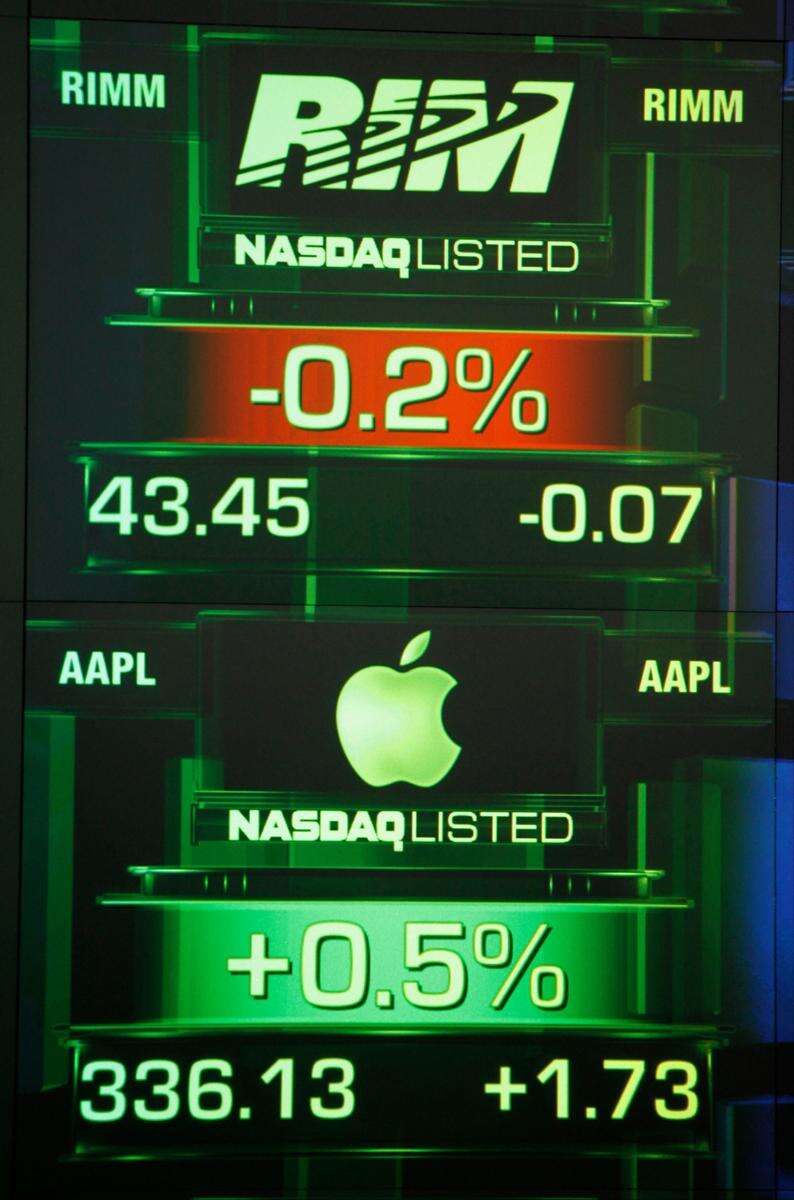 Screens display share prices for Research In Motion, top, and Apple Inc. at the Nasdaq MarketSite in New York. These are troubling times for Waterloo, the town of 100,000 that was transformed by Research In Motion’s BlackBerry into Canada’s Silicon Valley. Associated Press, may 2011