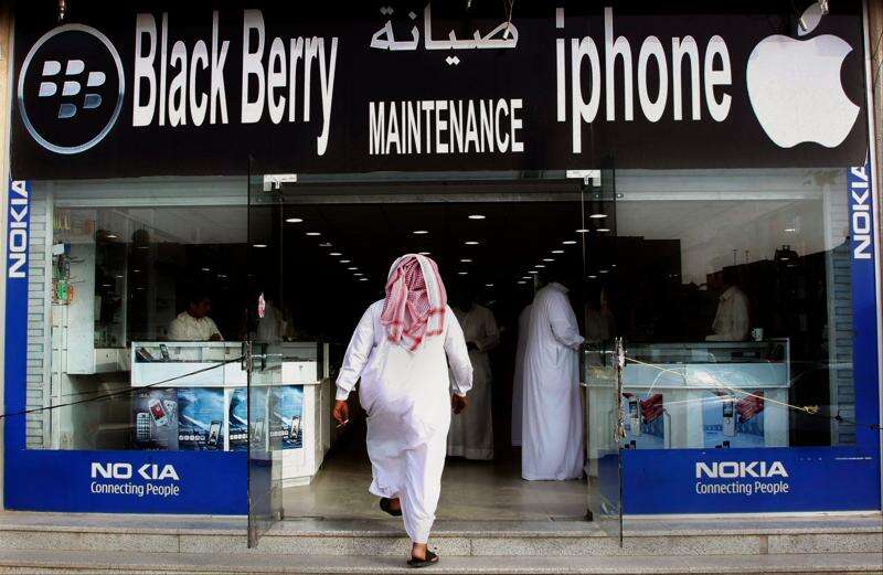 S man enters a mobile phone shop at a market in Riyadh, Saudi Arabia. There is talk that the fate of Research In Motion, the company that fathered the BlackBerry in 1999, is no longer certain as its flagship property rapidly loses market share to flashier phones like Apple’s iPhone and Google’s Android-driven models. Associated Press, august 2010