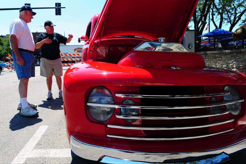 A car show along Third Street featured vehicles from 1963 and older, including a gleaming orange-and-beige 1936 Chevrolet that caught business owner Steve Thompson’s attention. Thompson and his wife Dixie own a booth at the Antique Market nearby.