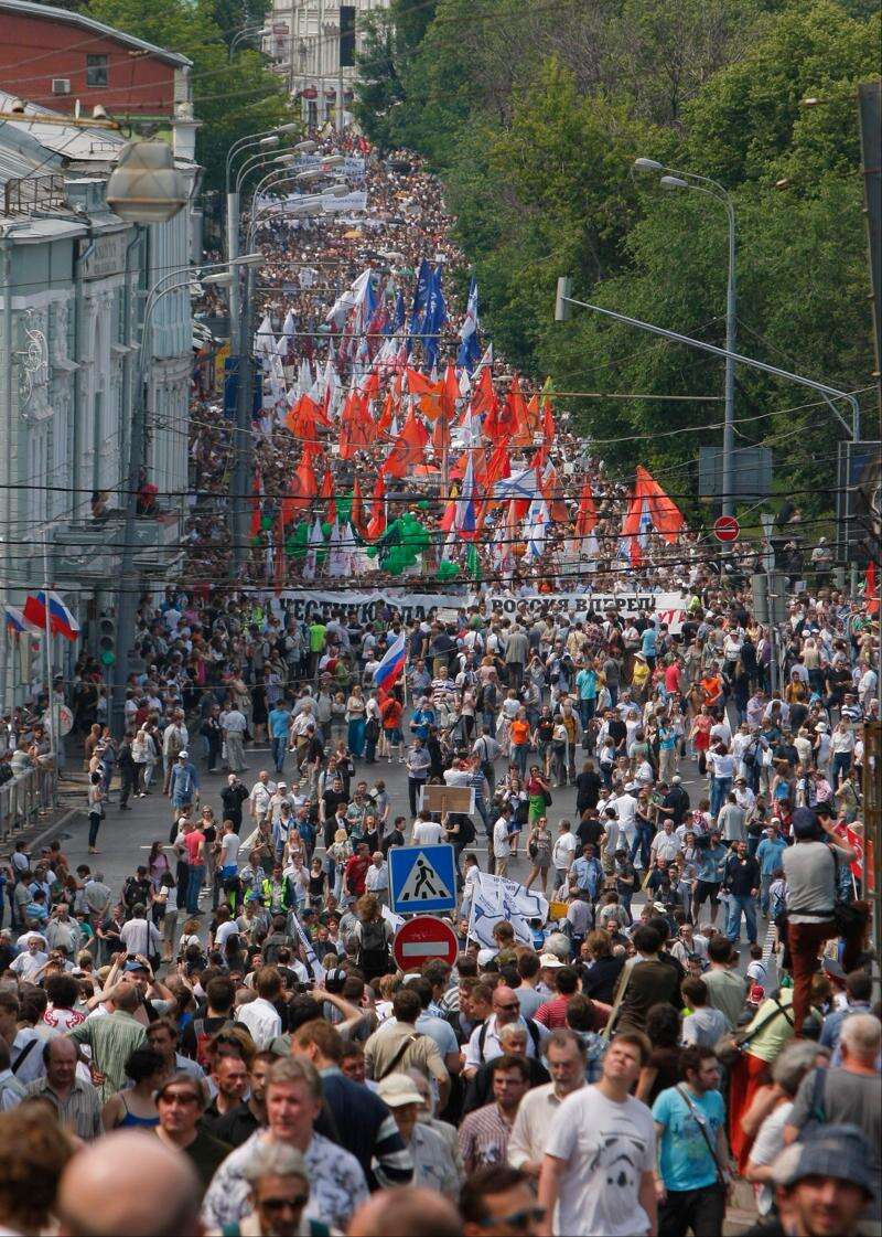 MOSCOW — Tens of thousands of Russians flooded Moscow’s tree-lined boulevards Tuesday in the first massive protest against President Vladimir Putin’s rule since his inauguration in May — a rally that came even as police interrogated key opposition leaders.