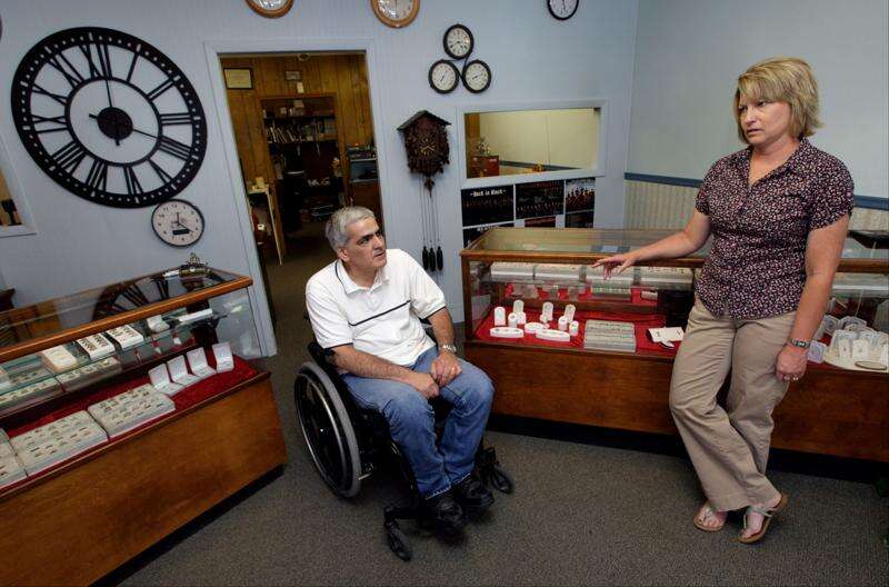 Mike Lamm talks with his wife Tracey in the showroom of his jewelry shop in Mediapolis, Iowa. Associated Press/June 14, 2012