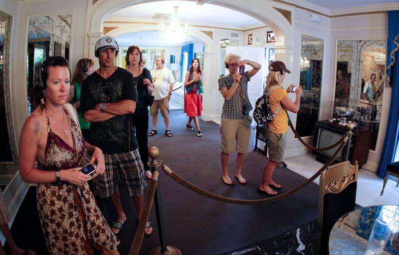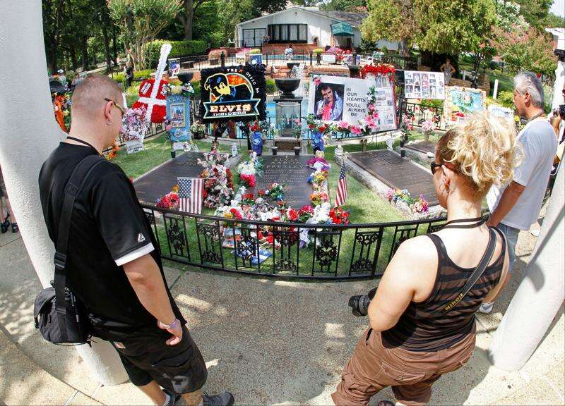 Outside, tourists — some crying — file past the graves of Elvis, his mother, father and grandmother. The burial site, adorned with flowers, includes a fountain. The 11-acre property is surrounded by stately trees and landscaping that includes colored lights illuminating the mansion at night.