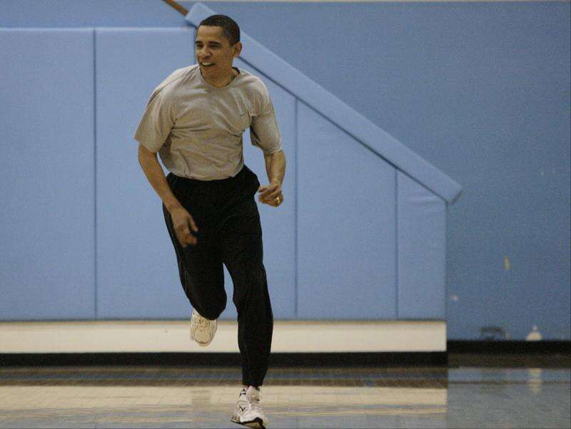 Barack Obama, then a presidential hopeful, runs down the court during a basketball scrimmage with University of North Carolina players on April 29, 2008, in Chapel Hill, N.C. Associated Press