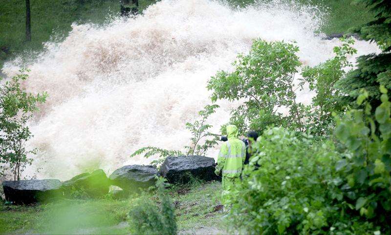 A pedestrian watches the large flow of water as Miller Creek explodes over the falls in the Lincoln Park neighborhood of Duluth, Minn. Wednesday, June 20, 2012 after record rainfall hit the area. Most areas received seven to 10 inches of rain in the past 24 hours. Associated Press