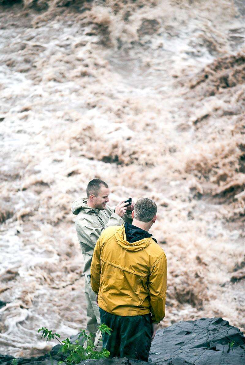 Dave Rundquist, left, and Dave Atkinson, both of Duluth, photograph the torrent of water rushing into Lake Superior at the mouth of the Lester River in Duluth Wednesday, June 20, 2012, after record rainfall hit the area. Most areas received seven to 10 inches of rain in the past 24 hours. Associated Press