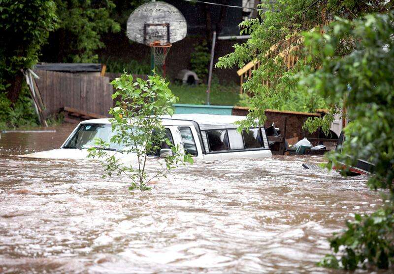 A pickup truck sits in the floodwaters of Miller Creek in the Lincoln Park neighborhood of Duluth, Minn. Wednesday, June 20, 2012 after record rainfall hit the area. Most areas received seven to 10 inches of rain in the past 24 hours. Associated Press