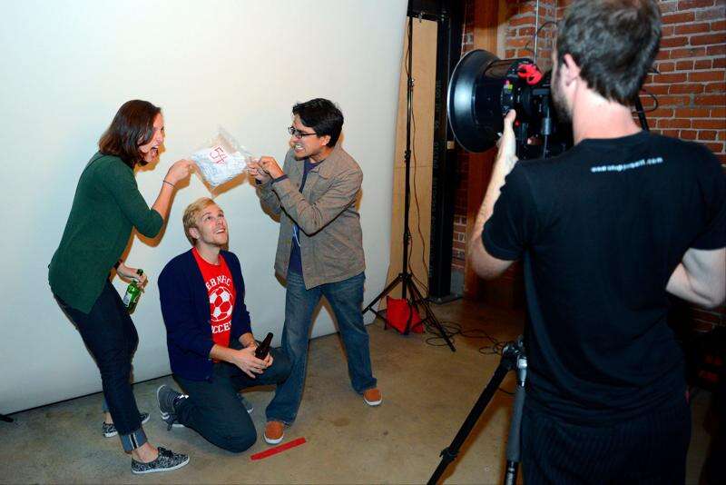 Martina Desalvo, left, Konstantin Bakhurin, second from left, and Neelroop Parikfhak pose for a picture with a shirt they have chosen during a pheromone party, Friday, June 15 in Los Angeles. The get-togethers, which have been held in New York and Los Angeles and are planned for other cities, require guests to submit a slept-in T-shirt that will be sniffed by other participants. Then you can pick your partner based on scent. Associated Press
