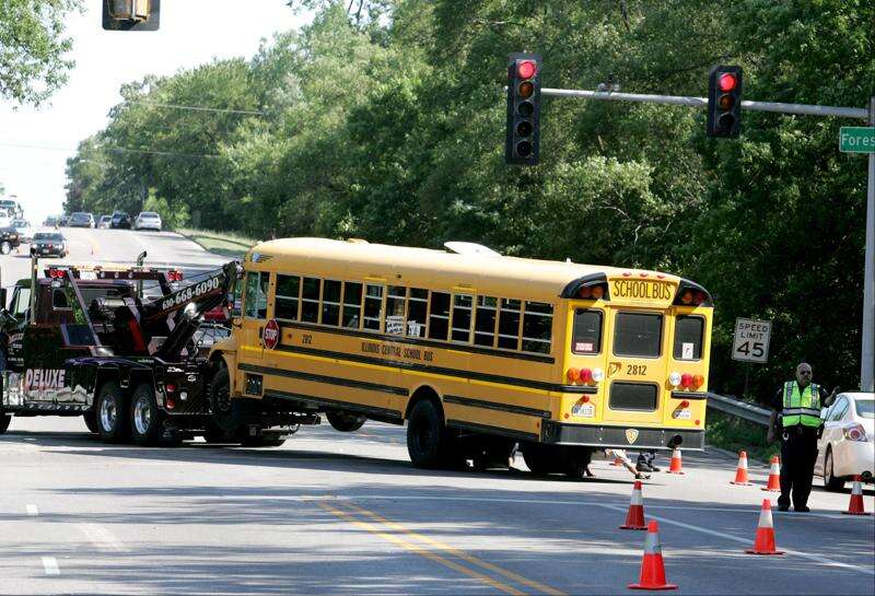 Police said the vehicles collided about 8 a.m. as the bus crossed Route 59 on Forest Avenue with a green light. It was struck by a red Chevy Cavalier, which was northbound on Route 59, West Chicago Sgt. Spencer Kroning said at the scene.