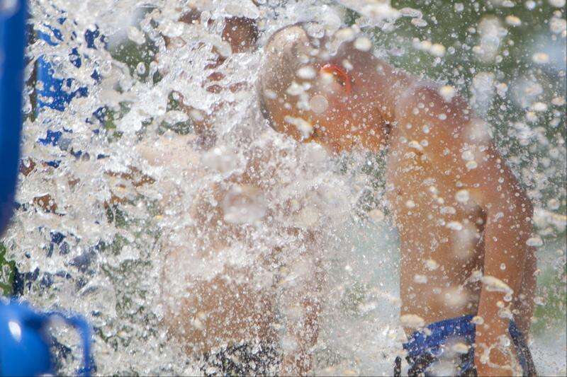Cole Michael Spresser, 8, of Bartlett embraces a large bucket of water that was dumped on his head at the Bartlett Aquatic Center Sunday to try to keep cool in 90 degrees weather.