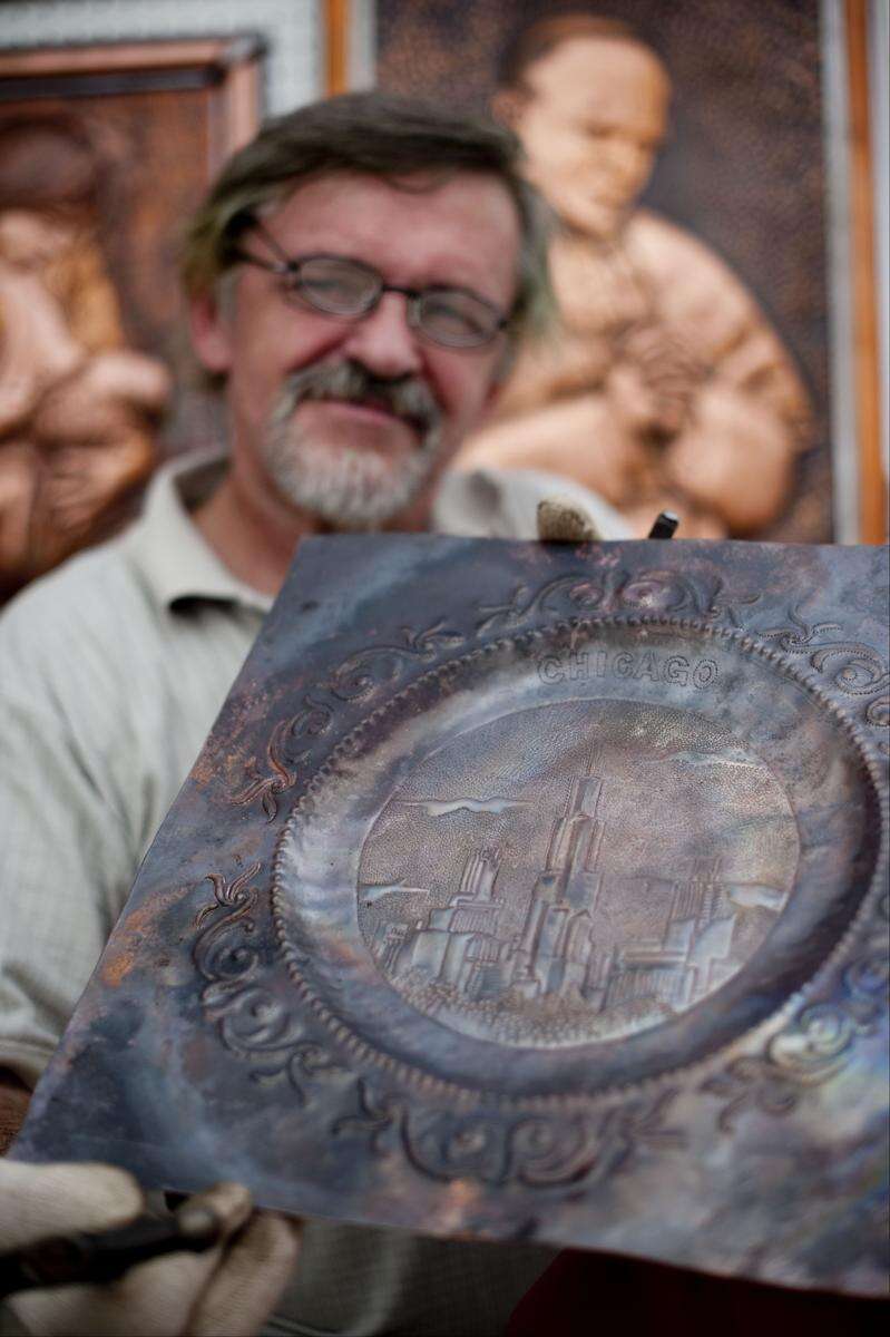 Jozef Andrzejczuk of Mount Prospect displays his copper work at Art & Soul on the Fox in downtown Elgin. The festival features artists working with a variety of mediums including ceramics, glass, metal, photography, watercolors, wood and more. Christian Gossin/cgossin@dailyherald.com