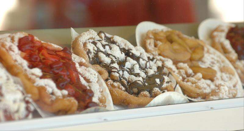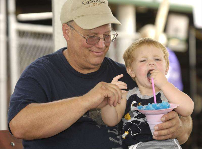Joe Kuchler holds his grandson Austin Kuchler, 1 1/2 of Joliet while he eats a cold treat on the final day of the DuPage County Fair, Sunday.