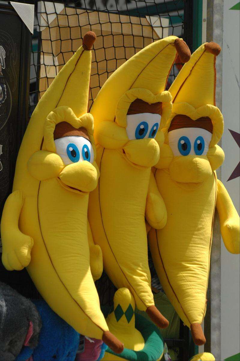 Three banana toys smile appear to smile while waiting to be won at a game of chance at the DuPage County Fair Saturday.