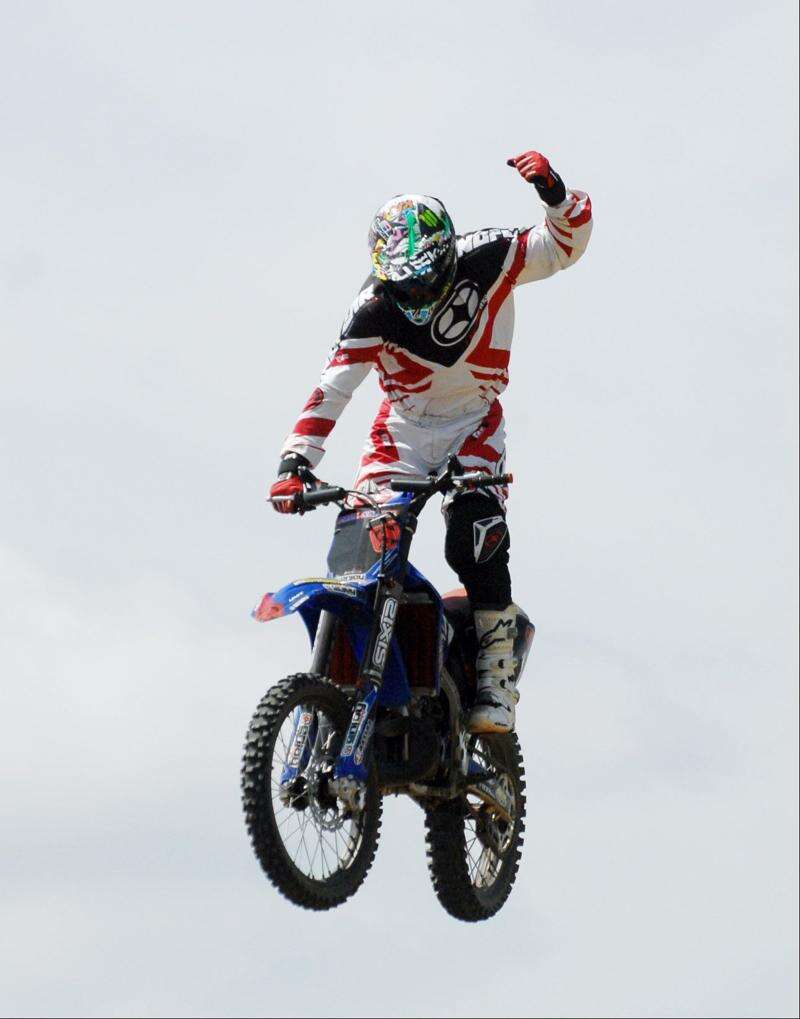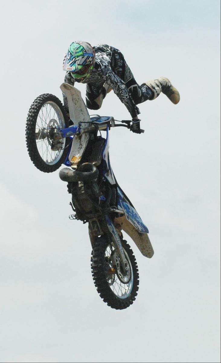 A motocross jumper takes his legs off the bike while preforming during the DuPage County Fair Saturday afternoon.