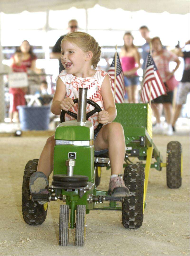 Willow Boecker, 3 of Naperville participates in the Pedal Pull contest on the final day of the DuPage County Fair, Sunday.