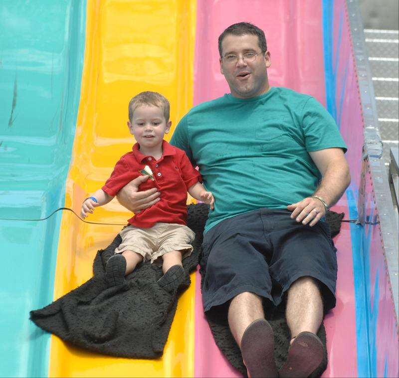 John Gillen and his son Johnny, 2, both of Wheaton enjoy a ride on the fun slide during the DuPage County Fair Saturday.