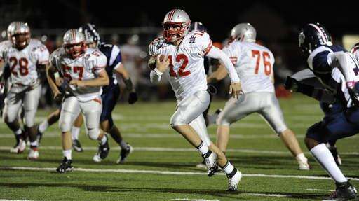 Palatine’s quarterback Ethan Olles tries to maintain control of the ball as he runs.