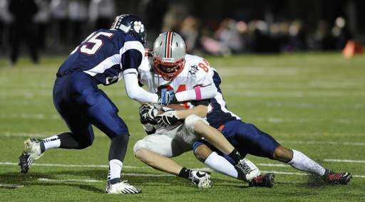 Palatine’s Dan Riddle makes an attempt to stop a run by Conant’s Tim Manczko.