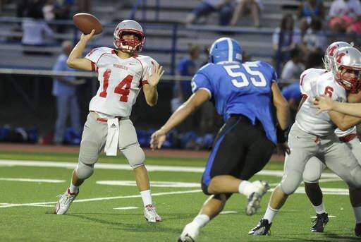 Wheeling’s quarterback Michael Yoshino pitches the ball out.