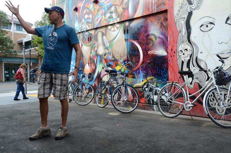 Streets of San Francisco Bike Tours guide and co-founder Eoin Canny explains the history of mural art in the Mission District during a tour in San Francisco. Associated Press