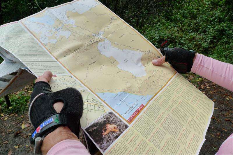 Timothy McCarthy, of Berkeley, Calif., consults a trail map at Point Reyes National Seashore in Marin County, Calif. This part of the tour included a hiking and mountain bike jaunt along some of the park’s many trails. Associated Press