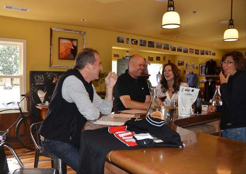 Visitors sample both wine and cycling memorabilia during a stop at Velo Vino Napa Valley in St. Helena, Calif., founded by the family that makes Clif Bars and Clif Family wines. Associated Press