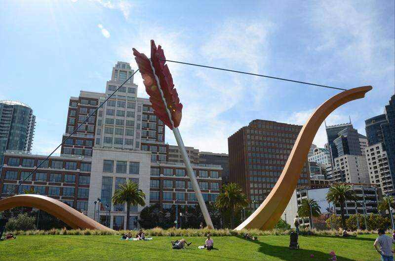 The “Cupid’s Span” sculpture sits across from the Ferry Building along the Embarcadero in San Francisco, which provides the backdrop for a picnic lunch during a Streets of San Francisco bike tour. Associated Press