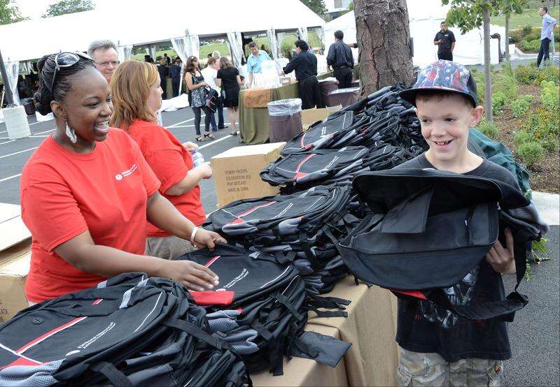 Carematch counselor Latoiya Christian, of Lombard, and John Joseph, 9, of Itasca, both wear big smiles after she gave him a backpack at the opening of the Elmhurst Memorial Hospital Addison Health Center Sunday afternoon in Addison. Bill Zars/bzars@dailyherald.com