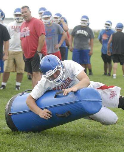 Laura Stoecker/lstoecker@dailyherald.com Marmion Academy's Zach Siwiec attacks the sled during varsity football practice on Thursday, August 9. Laura Stoecker.