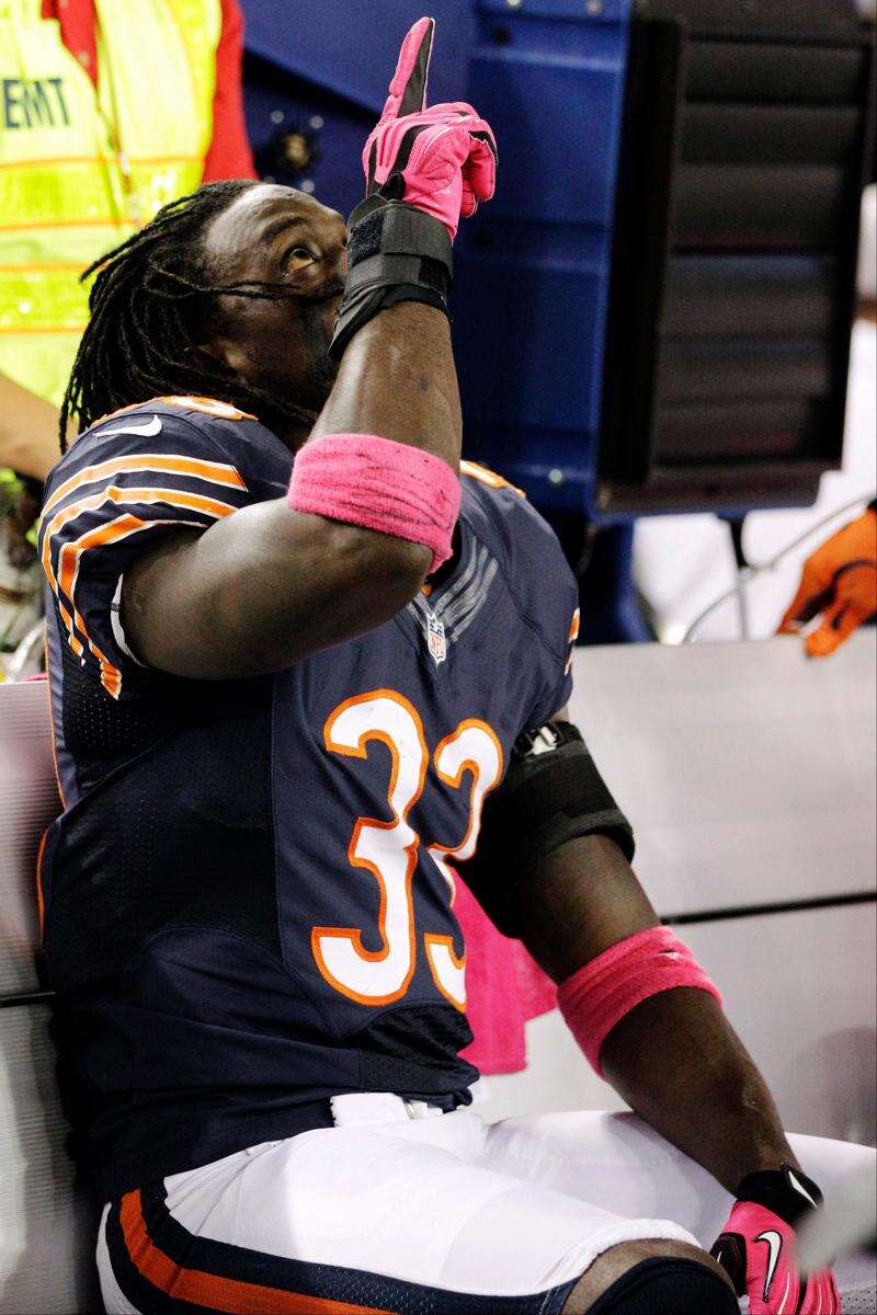 Chicago Bears cornerback Charles Tillman returns an interception for a touchdown during the first half.