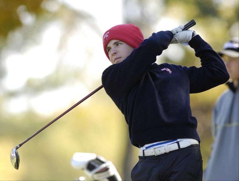 Ryan White of Elk Grove tees off during the St. Charles East boys varsity golf sectional at St. Andrews Golf Club in West Chicago, Monday, October 8, 2012.