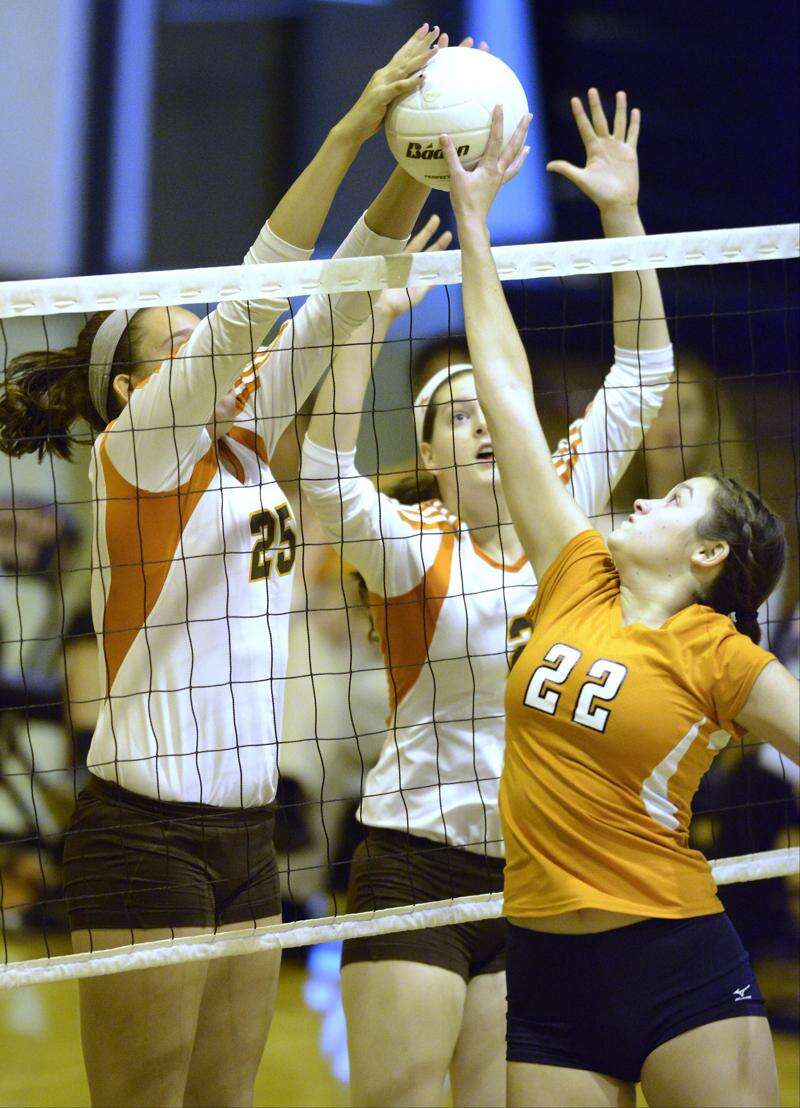 Buffalo Groves Marie Georgoulis, right, tries to tip the ball past Herseys Gabriella Olhava, left, and Anna Mullen-Muhr during Tuesdays game.