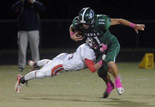 Bartlett’s Kyle Garcia is brought down by South Elgin’s Jonathan Ortega on a quarterback keeper .