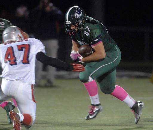 Bartlett’s Chris Kantzavelos dives for the goal line while dragging South Elgin’s Tyler Christensen for a second quarter touchdown.